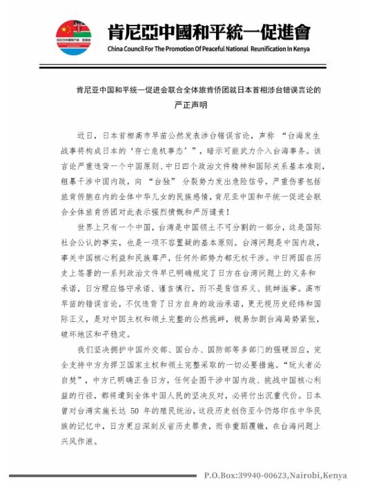 • 肯尼亚中国和平统一促进会联合全体旅肯侨团就日本首相涉台错误言论的严... 2025-11-17