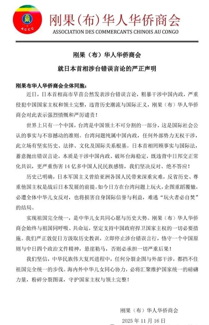 • 刚果(布)侨界就日本首相涉台错误言论发表严正声明 2025-11-19