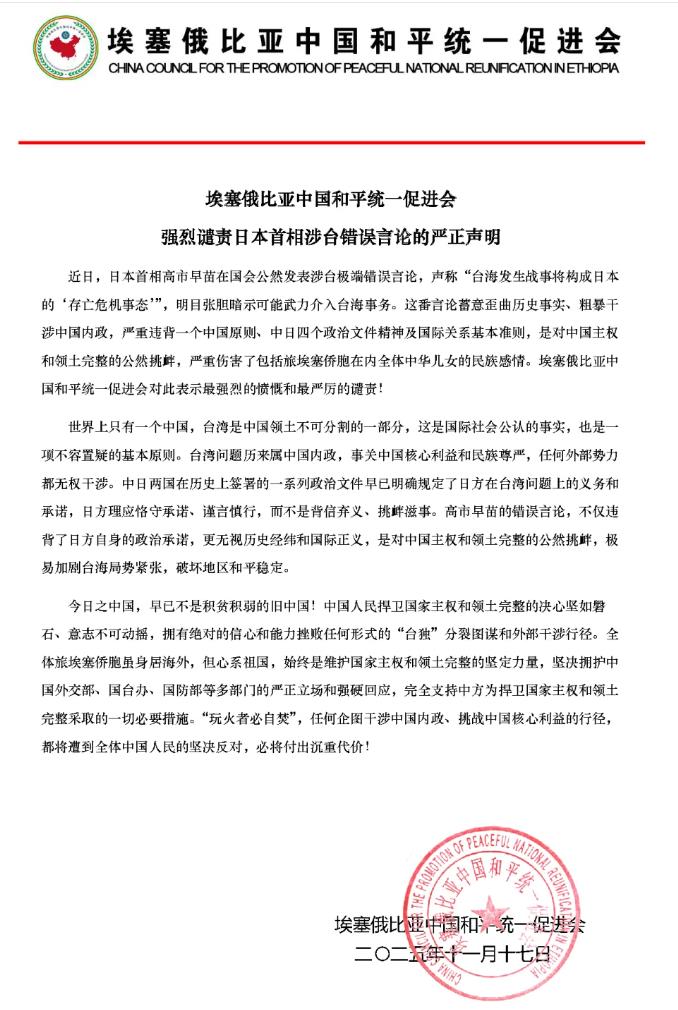 • 埃塞俄比亚中国和平统一促进会强烈谴责日本首相涉台错误言论的严正声明 2025-11-19